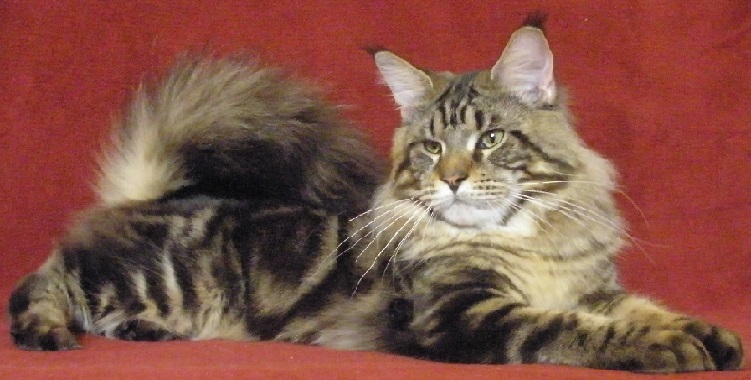 Představujeme naši kočičku - My Maine Coon breeding female - katzen - Mercedes Lady of Sand Mines: born: 14. 2. 2011 Mercedes je mimořádně velká kočička, excelentního, výstavního exterieru a mimořádně přítulné, nekonfliktní a nebojácné povahy. Na první pohled upoutá svým impozantním vzezřením, výraznou barvou a úžasným výrazem. Miluje lidi i psy. Je čistotná a přátelská. Mercedes váží 9 kg a měří 110 cm !!!! Barva černá mramorovaná, MCO n 22 - Colour: Black classic tabby CHAMPION Zdravotní testy: FIV negative, FeLV negative Rodiče (parents) HCM N/N (A31P N/N, A74T N/N)
